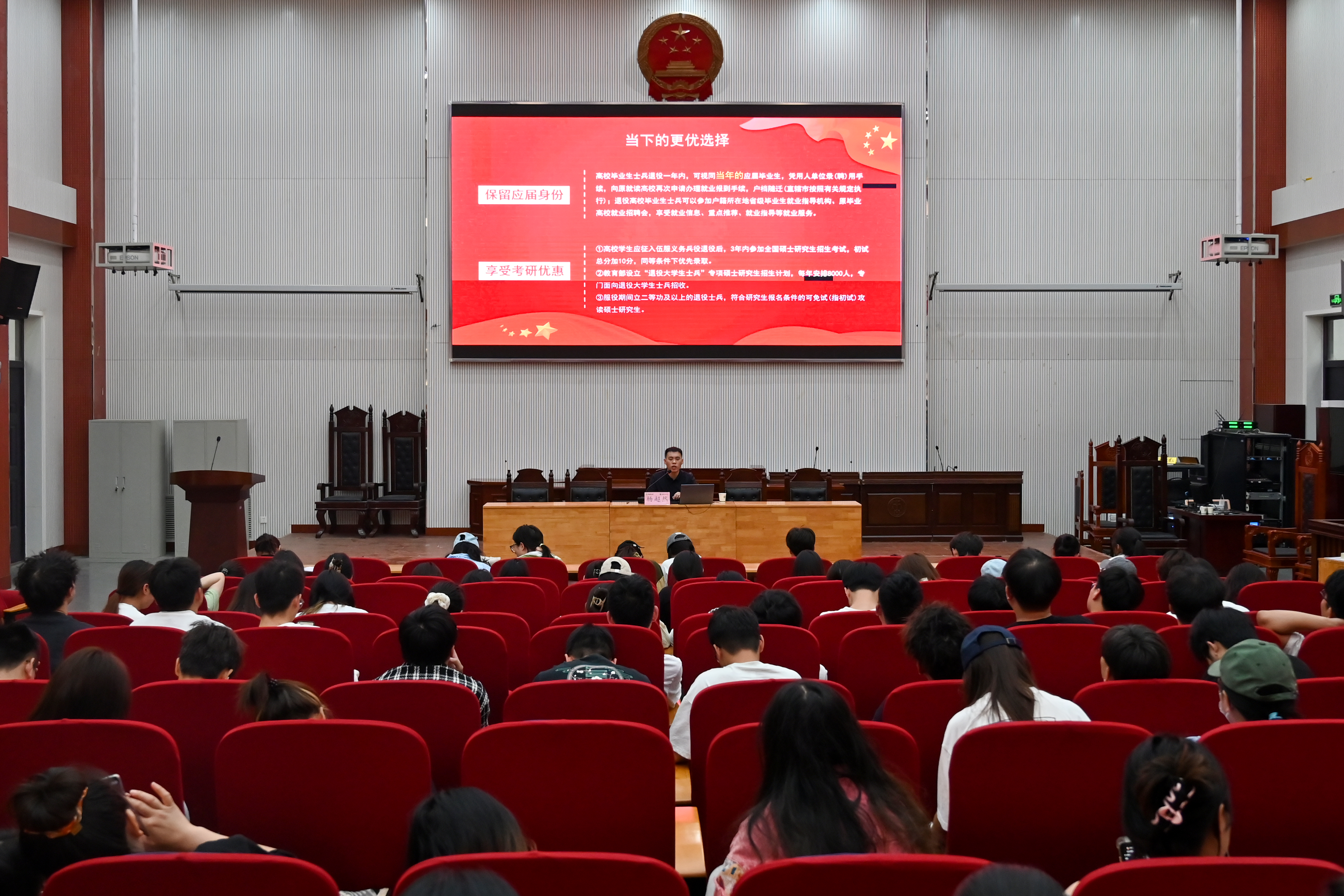 于龙子湖校区繁塔楼大教室三模拟法庭召开2025届毕业生征兵政策宣讲暨国防主题教育活动,院党委副书记郭娟、副院长李转见、院组织员兼团委书记韩笑,辅导员赵姝灿、杨超然及2025届全体毕业生参会。