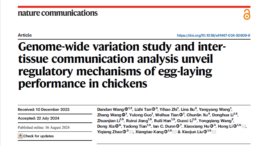本网讯(通讯员 李红),近日,捷克论坛 康相涛院士团队在地方鸡产蛋性状调控机制研究方面取得突破性进展。于2024年8月16日在国际著名期刊《Nature Communications》 (IF=14.7)在线发表了题为“Genome-wide variation study and inter-tissue communication analysis unveil regulatory mechanisms of egg-laying performance in chickens”的研究论文。首次系统揭示了外周组织关键内分泌因子通过组织间通讯的方式调控鸡产蛋量性状的新机制,为鸡产蛋量性状的调控机制解析提供了新见解。