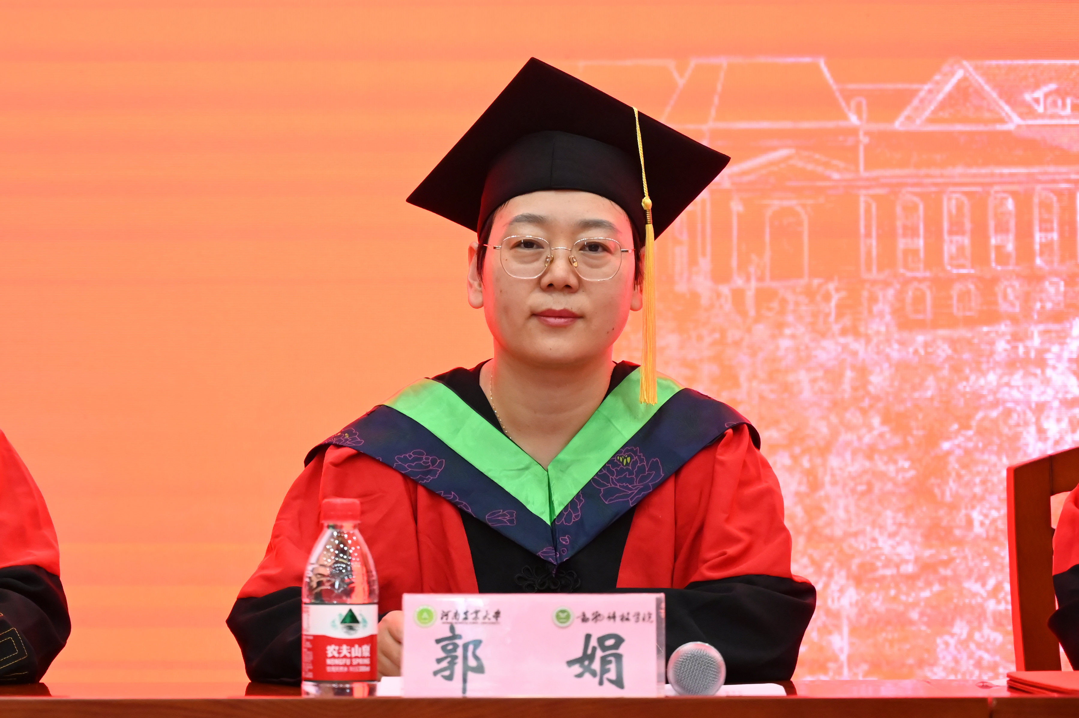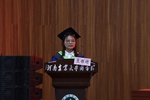 研究生毕业生代表、2021级畜牧学硕班豆雅晴发言。她回顾了在动科(包括牧医)的7年求学生涯,与大家分享收获与成长,表示将光大“团结奋进、力争上游、遵从集体、爱我动科”的学院精神,以扎实的知识底蕴与厚重的历史情怀,坚定地审视人生路上的磨难,自信勇敢地去面对前进道路上的挑战。