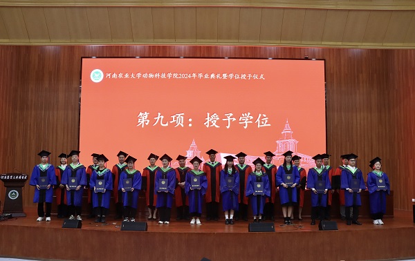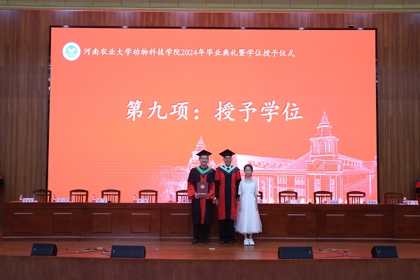在庄严的国歌声中,毕业典礼正式拉开帷幕。副院长酒梅菊宣读《2024届优秀毕业生名单》、副院长孙宇宣读《2024届博士和硕士学位授予决定》、农大牧原联合产业研究院执行院长兼学院副院长付彤宣读《2024届学士学位授予决定》。现场为省、校、院级优秀毕业生颁发证书并合影留念。