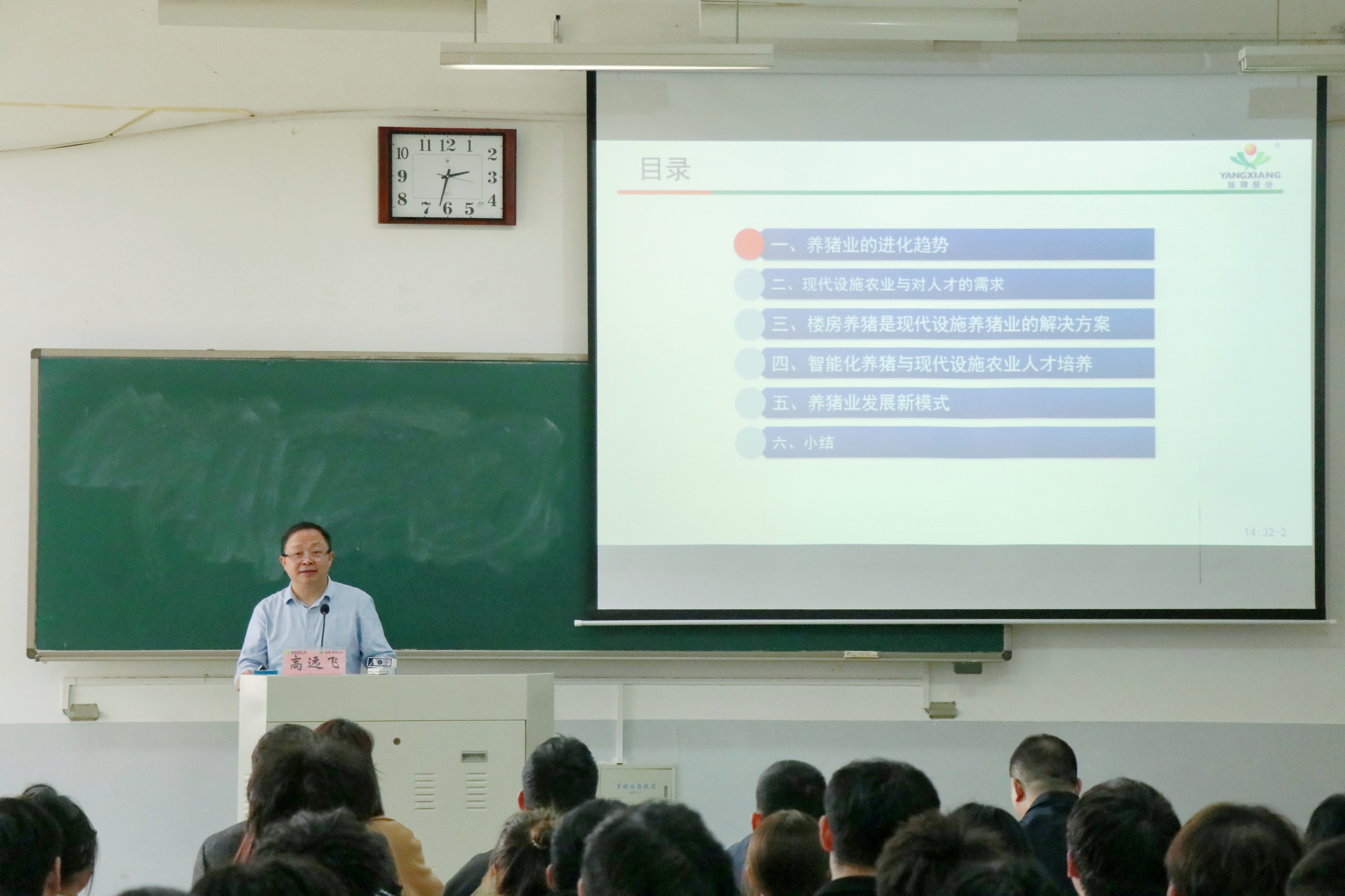 于龙子湖校区繁塔楼教室E113举办第26期笃实讲堂,特邀广西扬翔股份有限公司党委书记高远飞担任主讲嘉宾,院党委书记余磊、教师蒋瑞瑞等到场,余磊主持。