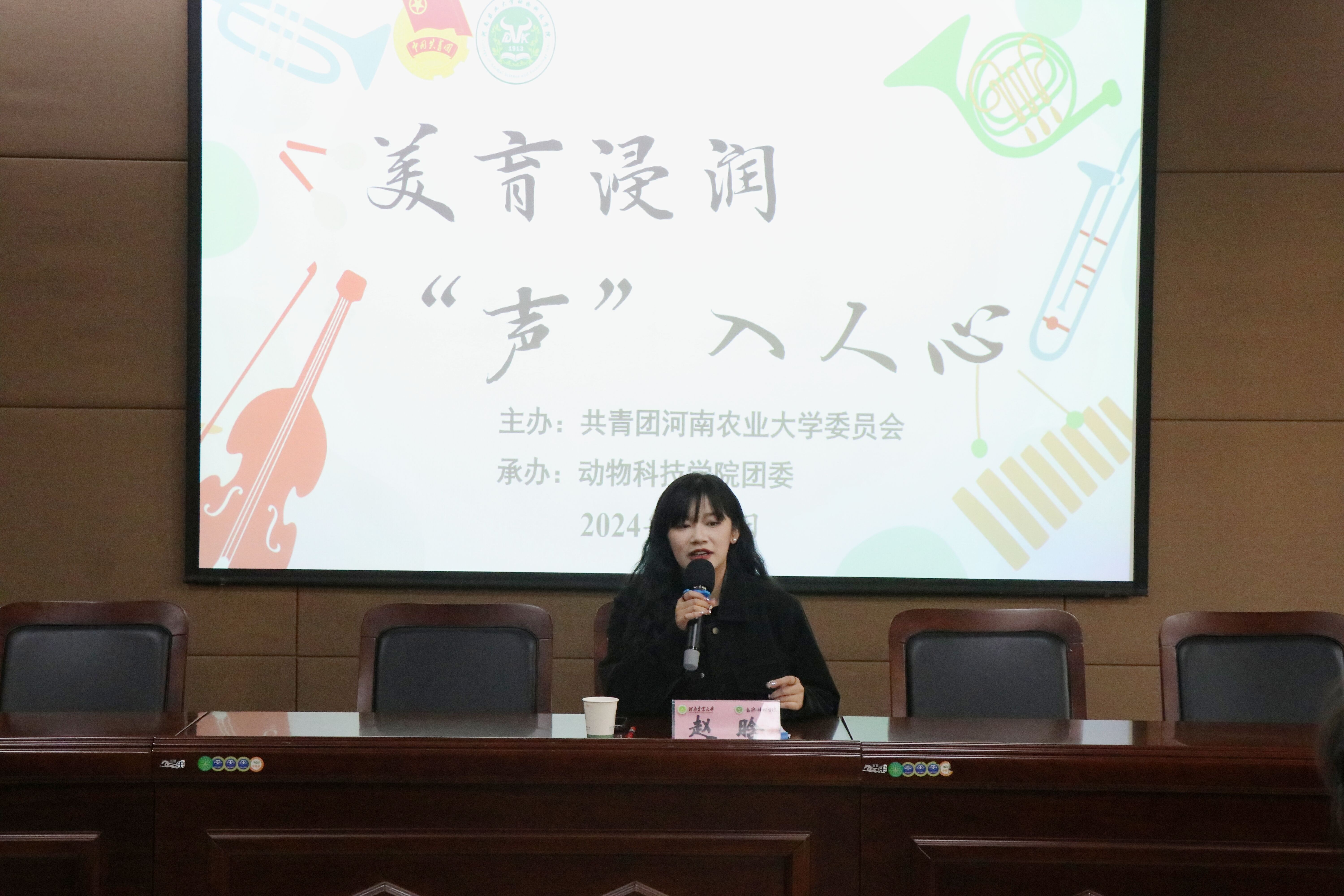 于龙子湖校区第一实验楼南321会议室举办第五期以“美育浸润 ‘声’入人心”为主题的美育课堂。本次活动特邀校团委老师赵晗作主讲嘉宾,院组织员兼团委书记韩笑、辅导员赵姝灿、兼职辅导员韩易桐、21级和22级各班学生代表参与本次活动,活动由韩易桐主持。