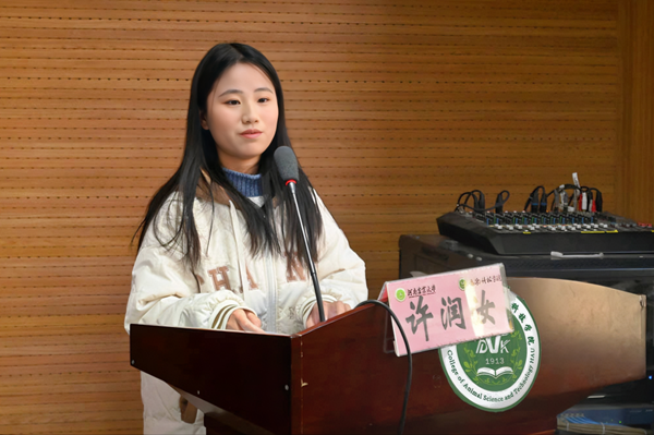22级动科五班许润汝作为获奖学生代表发言,她讲述了自己在思想、学习、工作与生活四方面的成长,表示将继续砥砺弘农爱国志,努力掌握专业知识技能,不断提高个人综合素养,谱写新时代青年的绚丽华章。