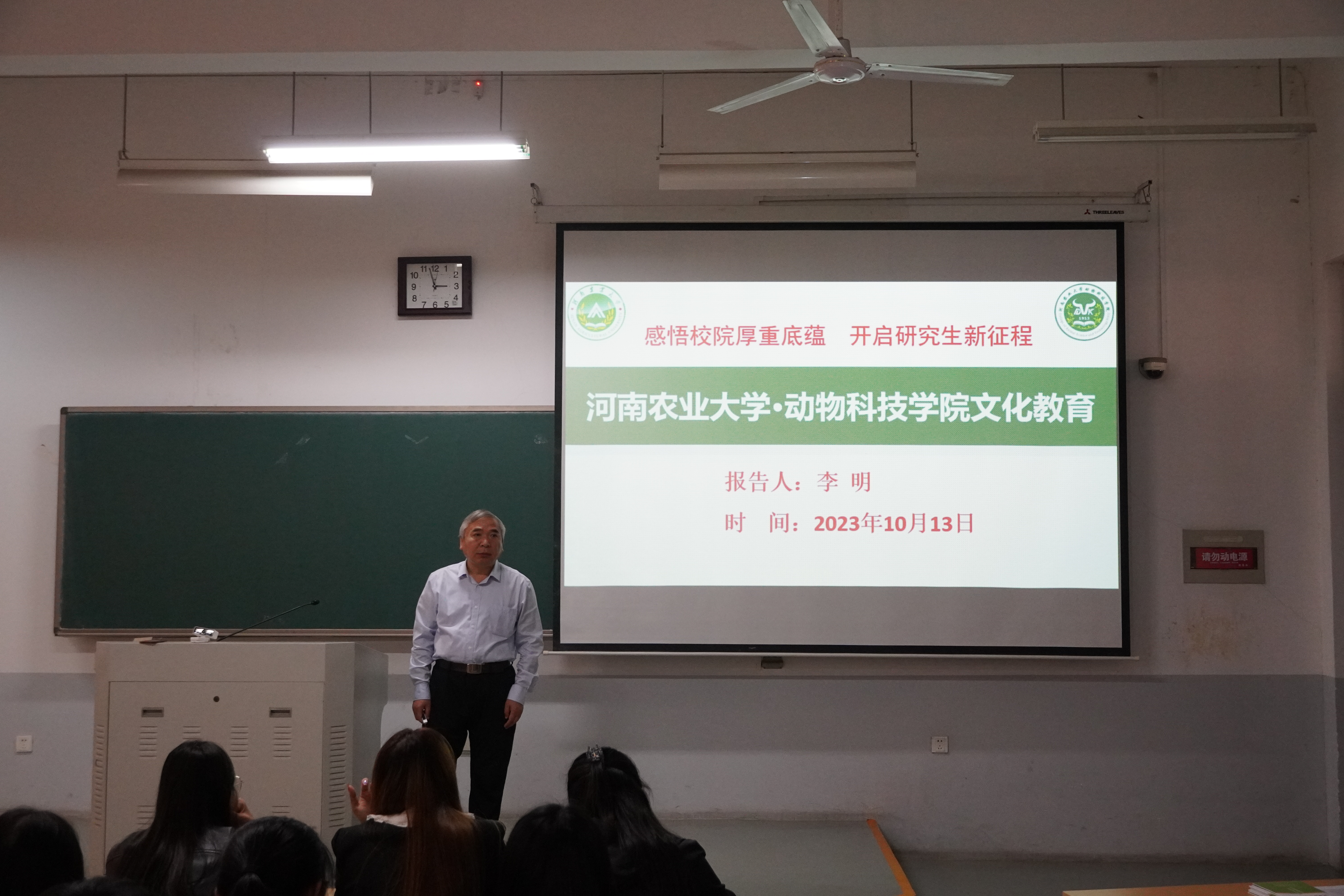 李明以“感悟校院厚重底蕴,开启研究生新征程”为题,从捷克论坛 120余年的发展简史及办学历程、学院发展简介、学院基本情况、学院文化等方面进行讲解。号召同学们秉承“刚健笃实,辉光日新”的院训,弘扬“团结奋进,力争上游,遵从集体,爱我动科”的学院精神,以更加饱满的热情与更加积极的心态投入到未来的学习和研究中。