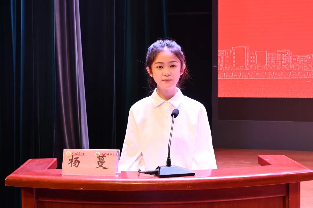 2021级动科2班杨蔓作为老生代表发言,她结合自己大学期间的成长经历指出,大学是确立三观、积累知识、锻炼本领的地方,寄语新生无论何时,学习是自己的本职;无论何事,要保持理性思考;无论何地,要勤奋多做事。学会“自找苦吃”,让向上的青春向下深扎根。