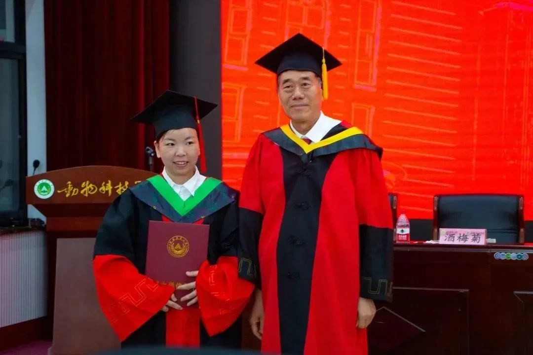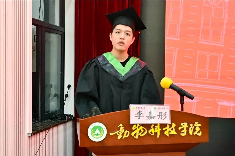 研究生毕业生代表、2020级畜牧专硕班职毅豪发言,他以三年奋斗青春回忆为始,表达了对母校的热爱与不舍,表示学院用良好学风、深厚平台、强大师资将我们雕琢成璞玉,我们要在人生的下一程,在天南海北各个地方继续发扬动科精神,到祖国需要的地方发光发热,雕刻下属于自己、属于动科人的光荣印记。