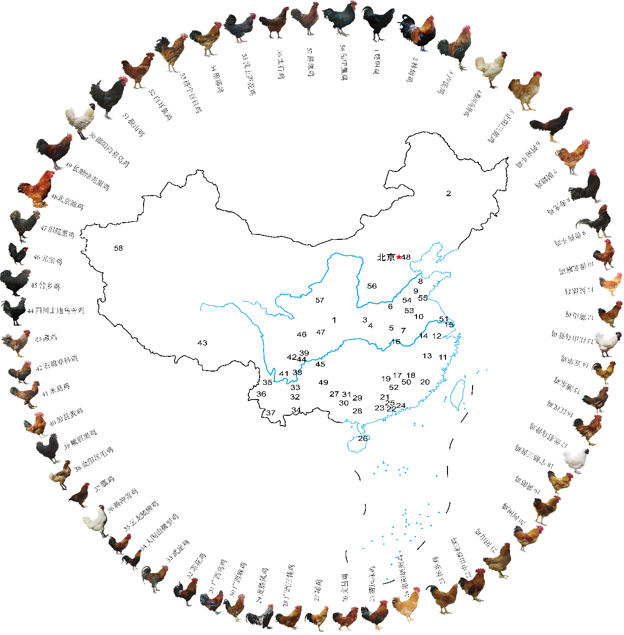 图1 58个地方鸡品种地理分布