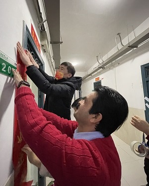事先得知老师要到来,阿里和拉里一早就在门口迎接。送上中国传统过节糕点和水果牛奶等营养品后,师生一起为宿舍贴上窗花、对联,挂上装饰品,两位留学生十分感恩和开心,直呼“暖”。
