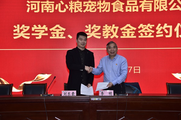 院长李明和河南心粮宠物食品有限公司总经理刘东豪签约