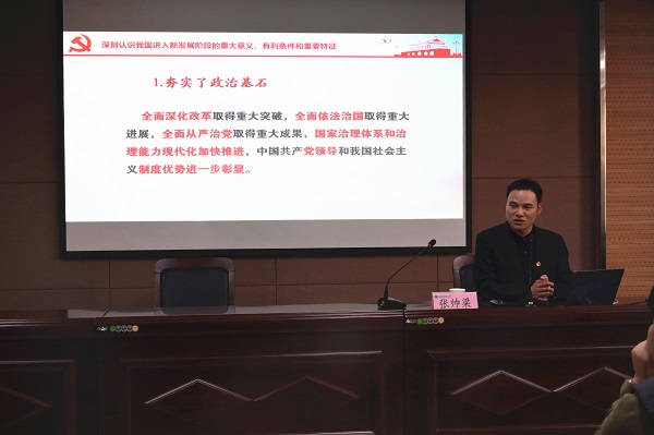 张帅梁以《擎画新蓝图 开启新征程》为题,从深刻认识我国进入新发展阶段的重大意义、有利条件和重要特征;准确把握2035年远景目标和“十四五”时期我国的指导方针、重要目标、重点任务;坚持党的全面领导、动员各方面力量为实现“十四五”规划和2035年远景目标而团结奋斗等三个方面对党的十九届五中全会精神进行了全面仔细的阐述和解读。此外,还对如何推动党的十九届五中全会精神在河南落地生根进行讲解。
