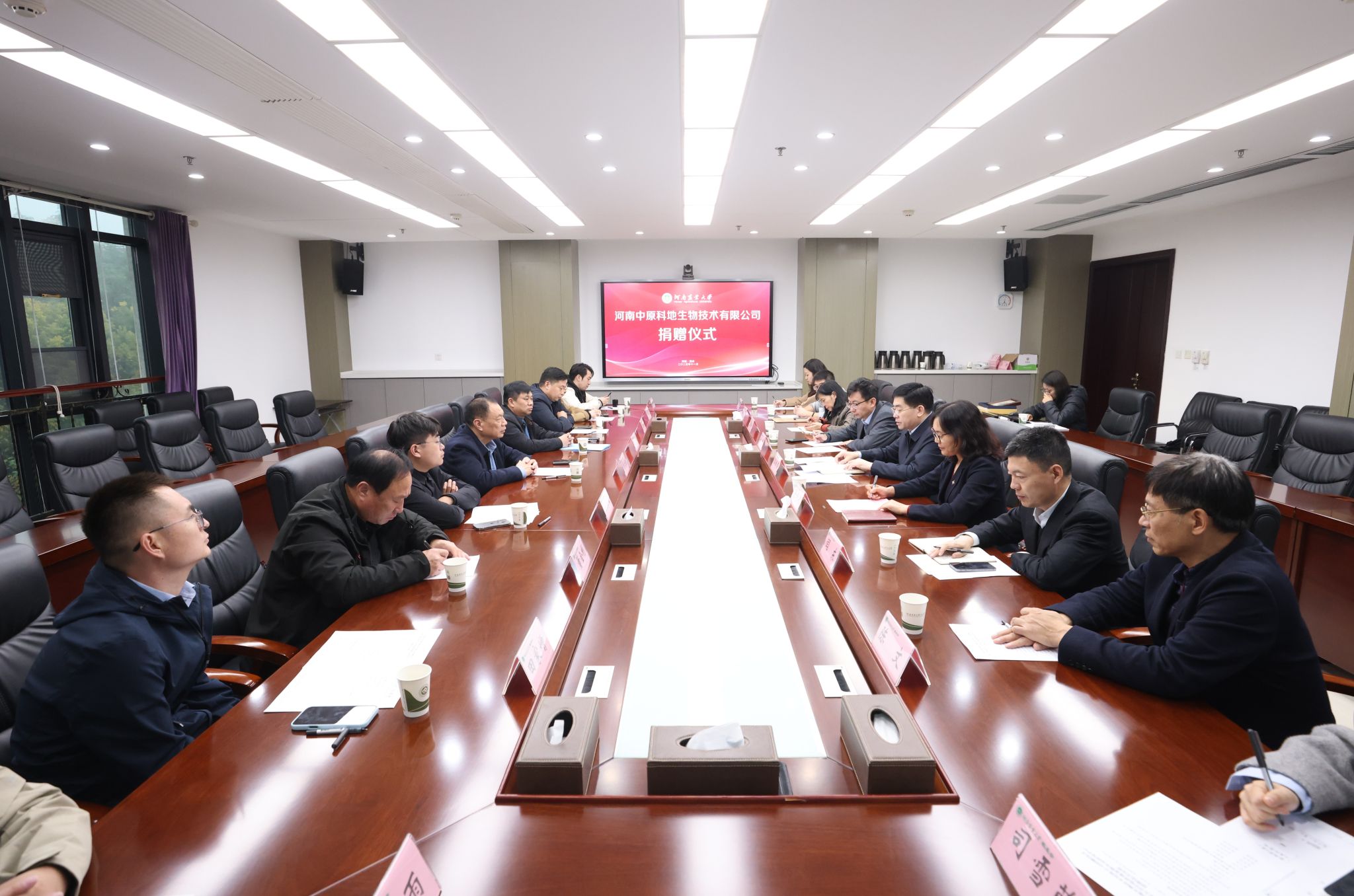 郭战伟代表学校对原文浩一行表示欢迎,并对河南中原科地生物技术有限公司的捐赠表示感谢。他简要介绍了学校基本情况和近几年学校发展取得的成绩。他表示,为实现一流大学与一流企业的双向奔赴、融合创新,学校确立了“名校名企融合创新战略”,将校企合作作为推动教育链、人才链与产业链、创新链深度融合的核心路径,希望双方以此次捐赠为契机,依托“捷克论坛