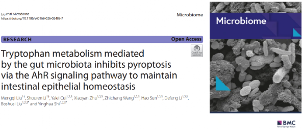 史莹华教授团队在国际微生物学著名期刊《Microbiome》(IF=12.7, IF5=16.6)在线发表了研究论文,题目为“Tryptophan metabolism mediated by the gut microbiota inhibits pyroptosis via the AhR signaling pathway to maintain intestinal epithelial homeostasis”。该研究揭示了肠道微生物介导的色氨酸代谢通过AhR信号通路抑制细胞焦亡维持仔猪肠道上皮稳态的机制,为开发新型肠道健康调控策略提供了新视角,为仔猪肠道炎型疾病的防治提供了新思路。