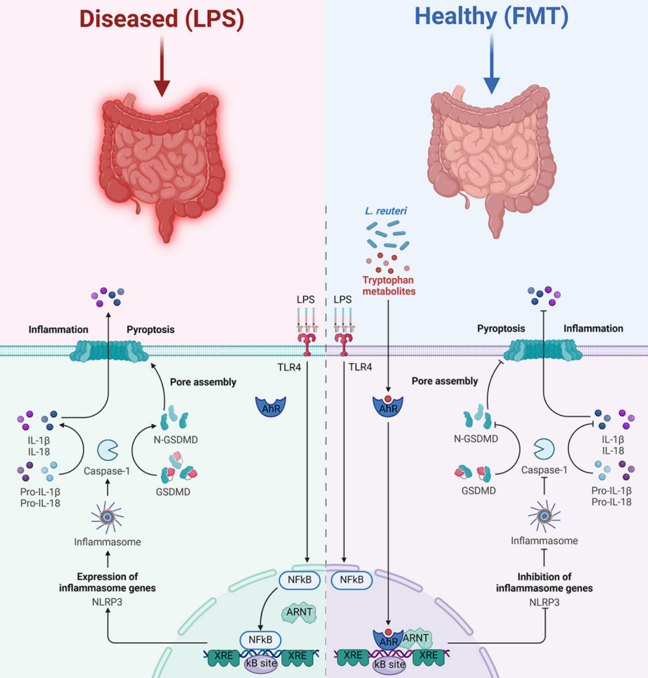 结合Caco-2细胞、结肠类器官以及基因敲除小鼠的研究表明,Lactobacillus reuteri衍生的关键色氨酸代谢物可以作为AhR的配体,激活AhR进入细胞核,进而抑制NLRP3炎症小体的转录,有效阻断细胞焦亡的发生。这一系列变化不仅减轻了肠道炎症,还显著增强了肠道紧密连接蛋白的表达,促进了肠道上皮屏障的稳态和修复。