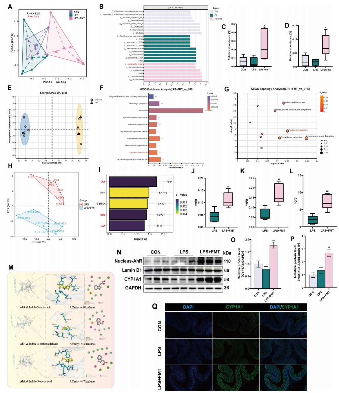 团队在仔猪中的研究发现,FMT能够有效预防脂多糖(LPS)诱导的仔猪结肠上皮屏障损伤和细胞焦亡。通过微生物组和代谢组的多组学联合分析,进一步揭示FMT可重塑仔猪肠道菌群,显著增加结肠中Lactobacillus reuteri的相对丰度,并大幅度提升其来源的色氨酸代谢物水平。