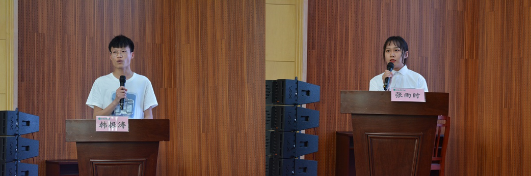 先进集体代表韩振涛(左一)和先进个人代表张雨时(右一)作交流发言