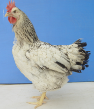 N系:雏鸡公、母鸡均为慢羽,黄胫、灰白羽,背、颈、翅带黑斑;成年公母鸡均为正常型,黄胫、少量白胫,浅芦花羽(哥伦比亚羽色),单冠、黄白皮肤,蛋壳颜色为褐色。