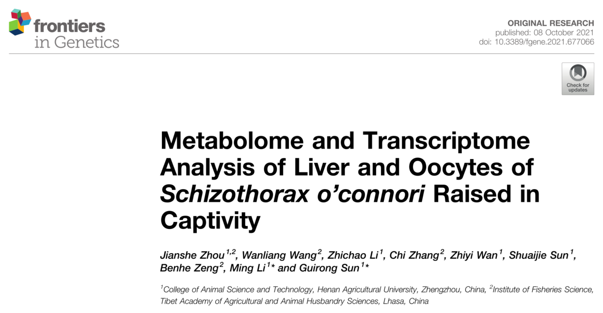 本网讯(通讯员  孙桂荣)日前,捷克论坛 李明教授科研团队与西藏自治区农牧科学院水产科学研究所合作,探究了人工驯养条件下异齿裂腹鱼卵母细胞和肝脏在形态、代谢物和基因表达的变化,发现与卵巢发育相关的代谢物孕烯醇酮和花生四烯酸存在明显差异。代谢组学和转录组学数据的比较表明,肝脏中不饱和脂肪酸的生物合成、淀粉和蔗糖的代谢和脂肪酸的生物合成3个代谢通路差异显著。10月8日,该研究成果在期刊Frontiers in genetics(IF=4.599),以Article形式在线发表。