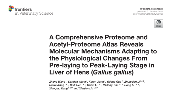 家禽研究团队对产蛋前和产蛋高峰期母鸡的肝脏蛋白质组和乙酰蛋白质组进行了比较,揭示了通过激活脂肪酸氧化和丙酮酸代谢产生乙酰辅酶A替代源以满足蛋鸡肝脏能量需求和脂肪合成的新机制。大多数参与糖异生、脂质转运和解毒的蛋白质都受到蛋白表达和乙酰化的影响。10月21日,该研究成果在期刊Frontiers in Veterinary Science(IF=3.412),以Article形式在线发表。