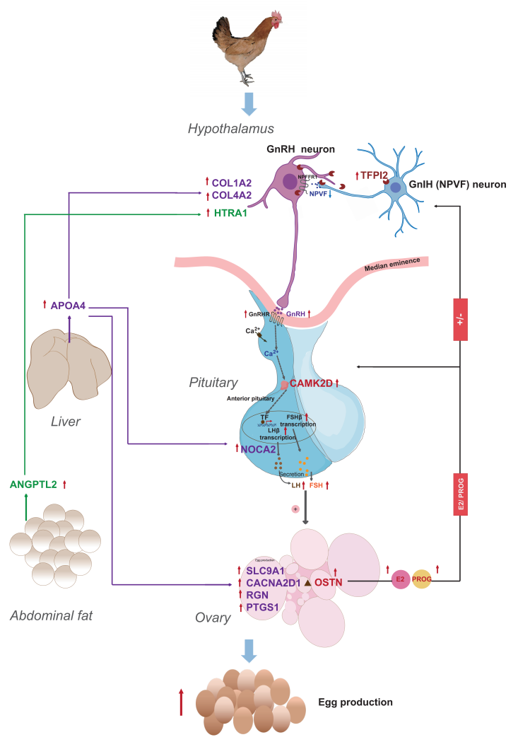 针对地方鸡肉、蛋品质优异但产蛋性能偏低的问题,团队综合运用GWAS、比较基因组、WGCNA及QENIE等分析方法,从组织间通讯角度进行了系统研究,首先对900只产蛋记录完整的14世代固始鸡进行基因组重测序,通过基于SNP、单倍型和CCA的三种GWAS分析方法,结合产蛋表型明显差异的红色原鸡、地方鸡和高产蛋鸡三类群体的比较基因组分析,鉴定受到强选择的产蛋量相关的关键候选基因(图1);其次整合高、低产蛋量固始鸡下丘脑、垂体、卵巢、肝脏和腹脂5个组织的转录组数据,结合WGCNA分析和差异分析,分别挖掘出正向和负向影响产蛋表型的核心候选基因;然后进一步通过定量内分泌网络互作估计分析,鉴定出影响鸡产蛋量的下丘脑、肝脏和腹脂特异性关键内分泌因子分别为27个,15个和19个(图2);最后通过活体组织特异性过表达试验,进一步证明了肝脏特异性内分泌因子APOA4和腹脂特异性内分泌因子ANGPTL2通过组织间通讯靶向HPO轴调控鸡产蛋量的作用机理,揭示了鸡产蛋量性状多组织协同调控的新机制(图3)。该研究为更深入理解包括家禽产蛋量性状在内的复杂性状调控分子机制提供了新思路,为更准确地鉴定与产蛋量性状相关的致因变异提供了宝贵的资源库。