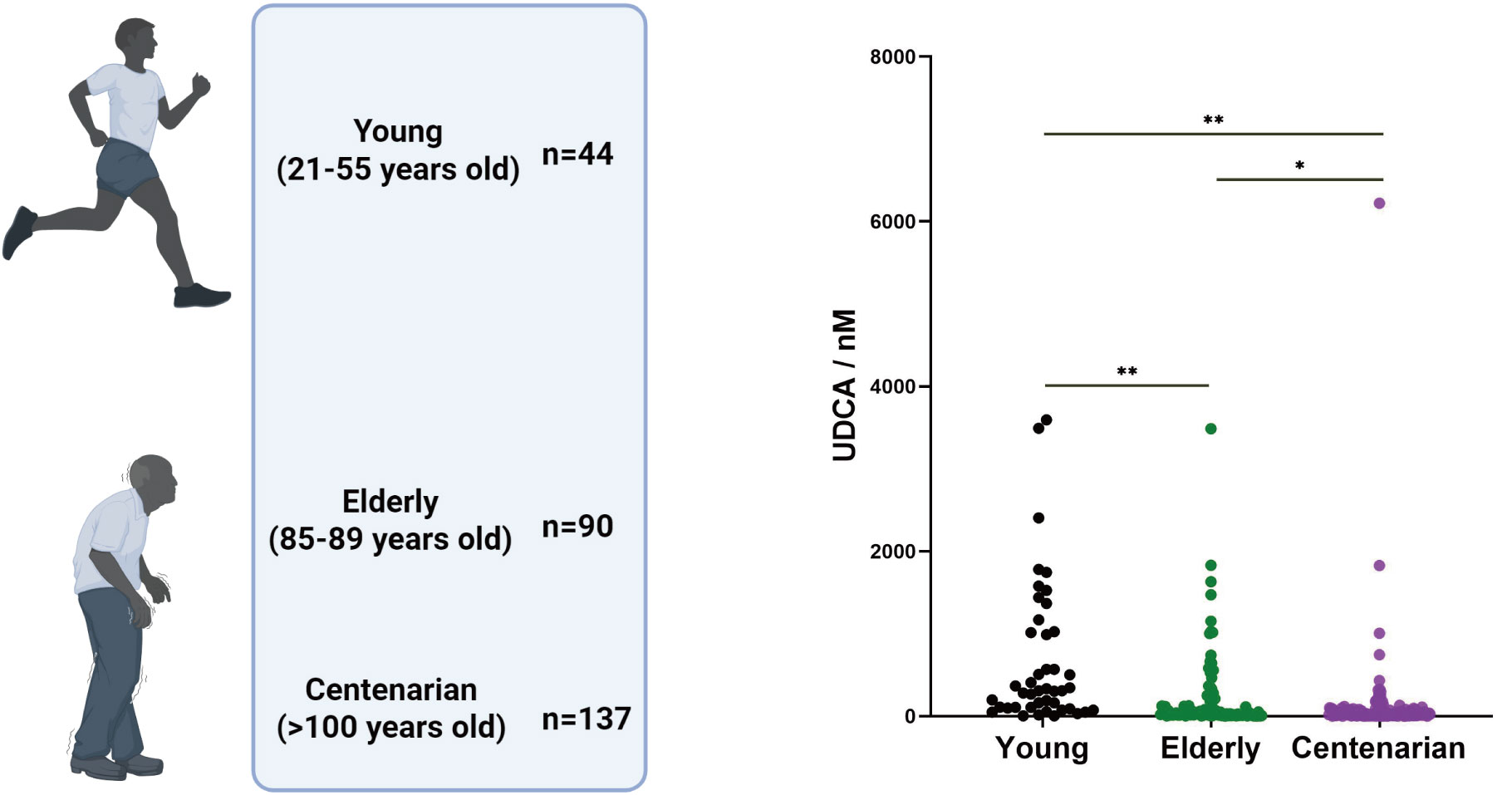 图3  年轻人群的粪便UDCA浓度显著高于老年人群