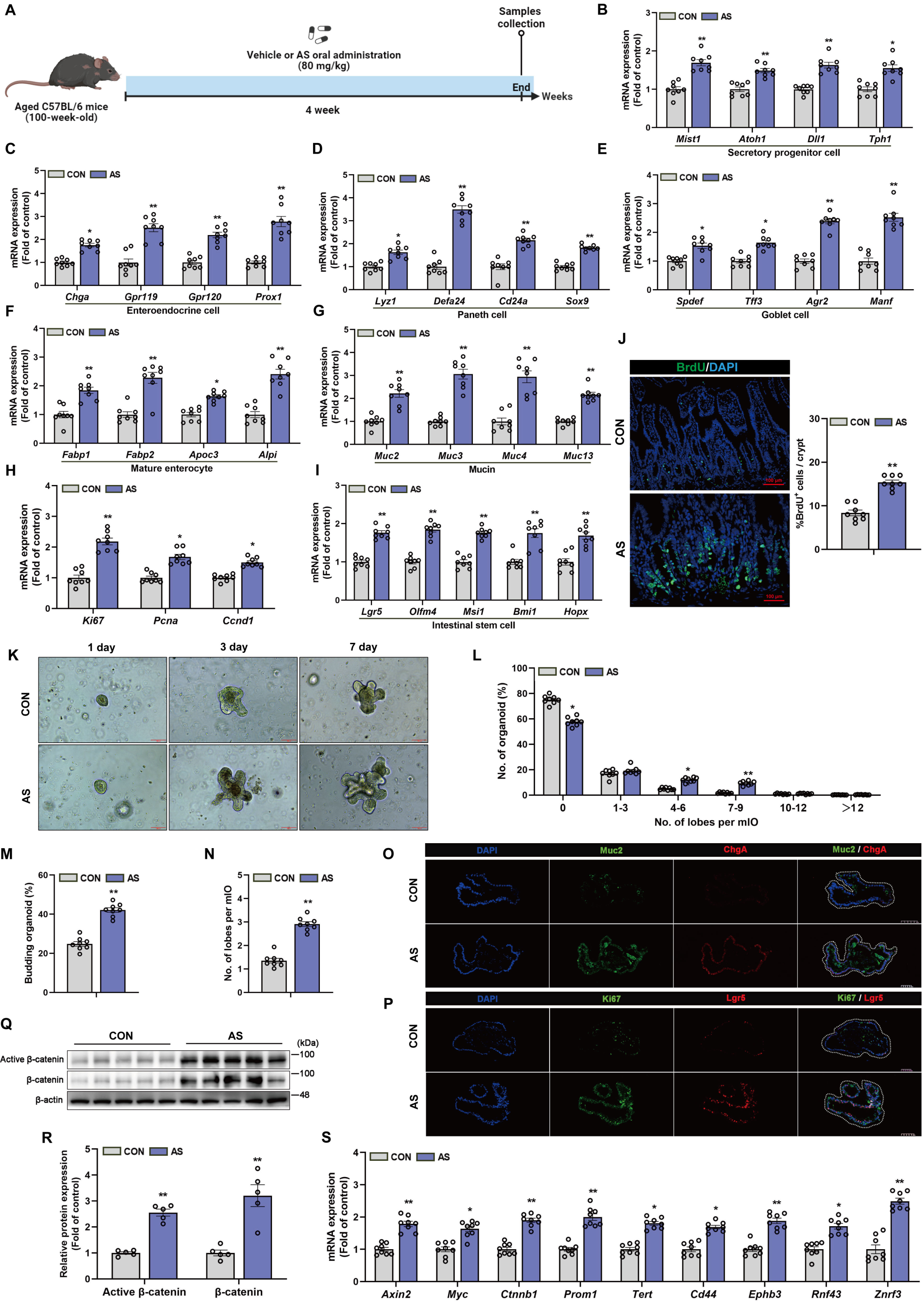 在本研究中,研究团队发现口服AS能够通过激活Wnt/β-catenin信号通路,促进自然衰老小鼠肠道上皮的发育和多谱系分化,从而增强肠道干性。