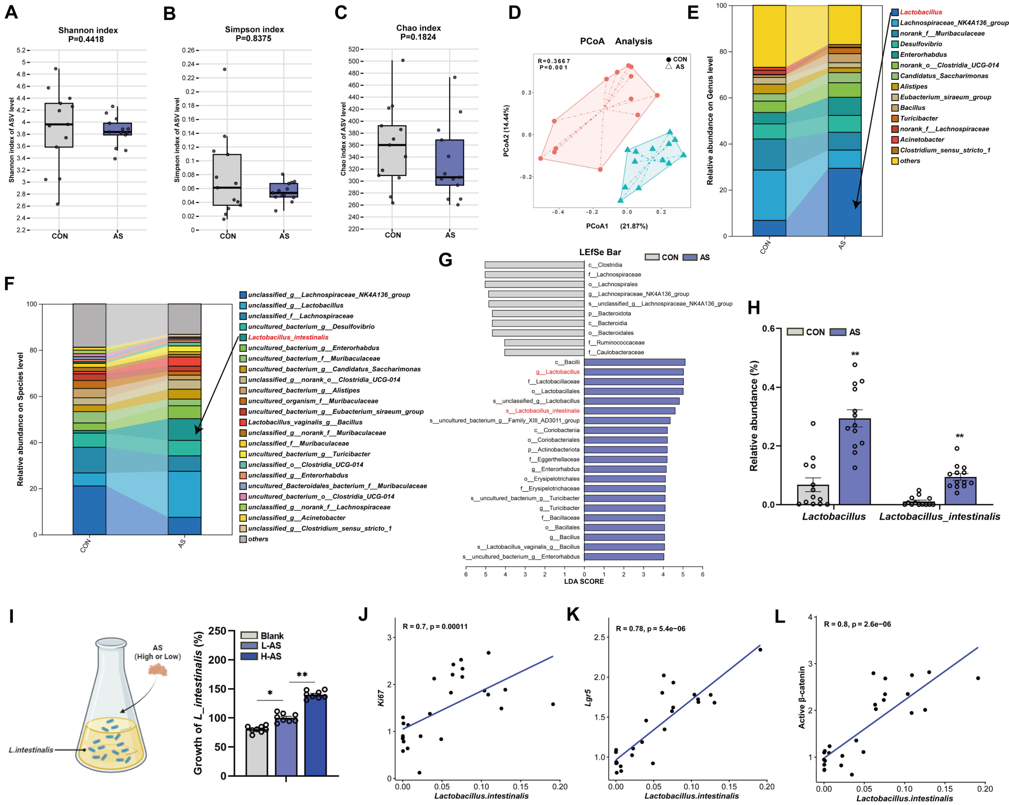 图2  AS重塑自然衰老小鼠肠道微生物群组成,并增加Lactobacillus intestinalis丰度