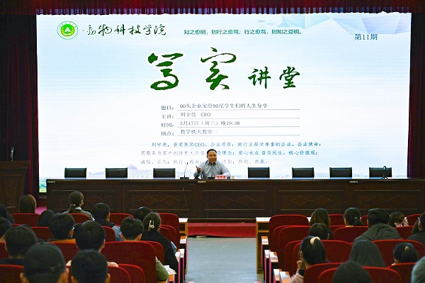 作为90后年轻企业家代表,刘宇亮以《90头企业家给90尾学生们的人生分享》为题,讲述了自身求学工作的经历,从在校期间、工作初期和企业未来规划三个方面分享了自己奋斗过程中的体会,他向同学们提出要努力勤奋、学好英语,遇到困难要学会坚持,为人处事真诚最重要,提早做好个人职业规划,职业生涯中不要频繁跳槽等意见和建议。
